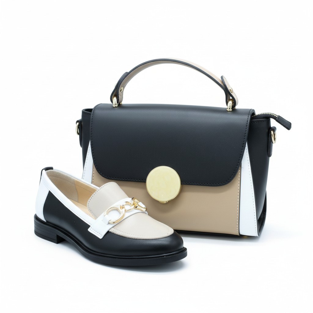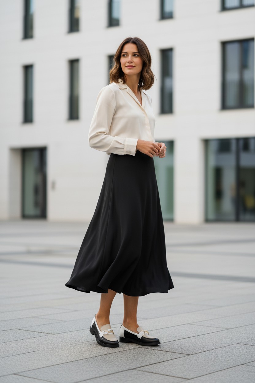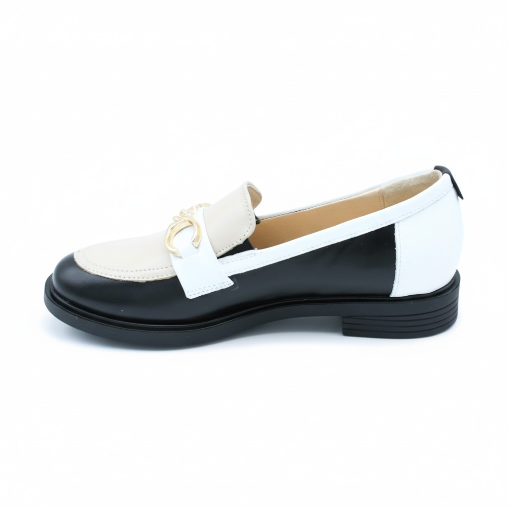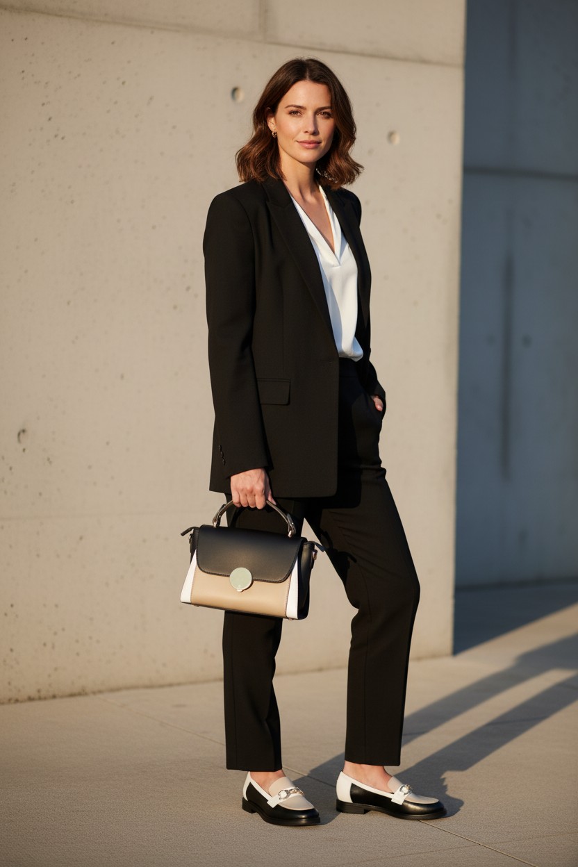Ten model wyjątkowo dobrze współgra z garderobą opartą na klasycznych kolorach. Pięknie wygląda w zestawieniu z czernią, ecru, kremem, jasnym beżem, czekoladowym brązem i chłodną bielą. Możesz też eksperymentować z każdym nasyconym kolorem (szmaragd, karmin, fiolet). Kluczem jest gładka faktura góry i gładki dół, aby pozwolić graficznemu wzorowi na loafersach „mówić” samym za siebie! Można nosić go do prostych spodni, miękkiej dzianiny i marynarki, ale równie dobrze prezentuje się ze spódnicą midi, elegancką koszulą czy minimalistyczną sukienką. Czarno-beżowe mokasyny bardzo dobrze przełamują formalne stylizacje, nadając im lekkości, a jednocześnie zachowując elegancki, dopracowany charakter. To model, który świetnie wygląda także w duecie z torebką utrzymaną w tej samej, spokojnej palecie kolorystycznej.