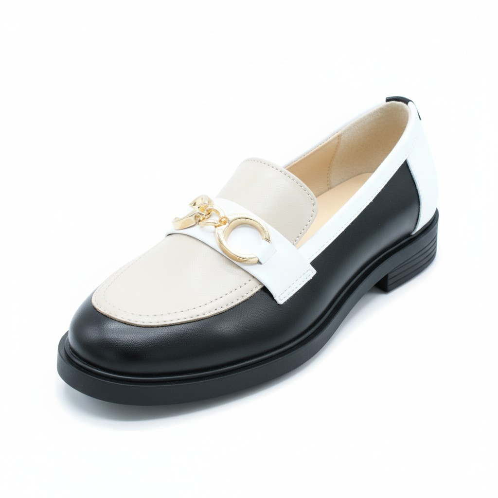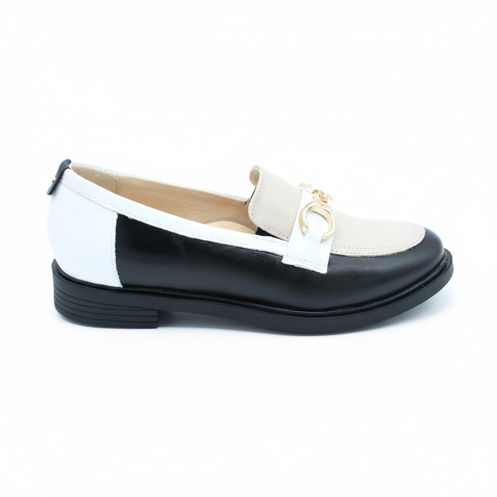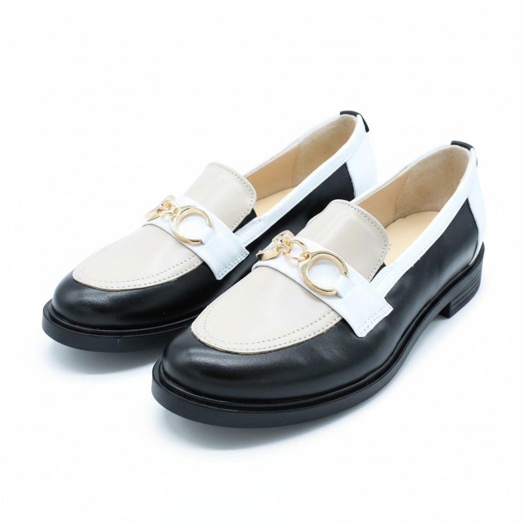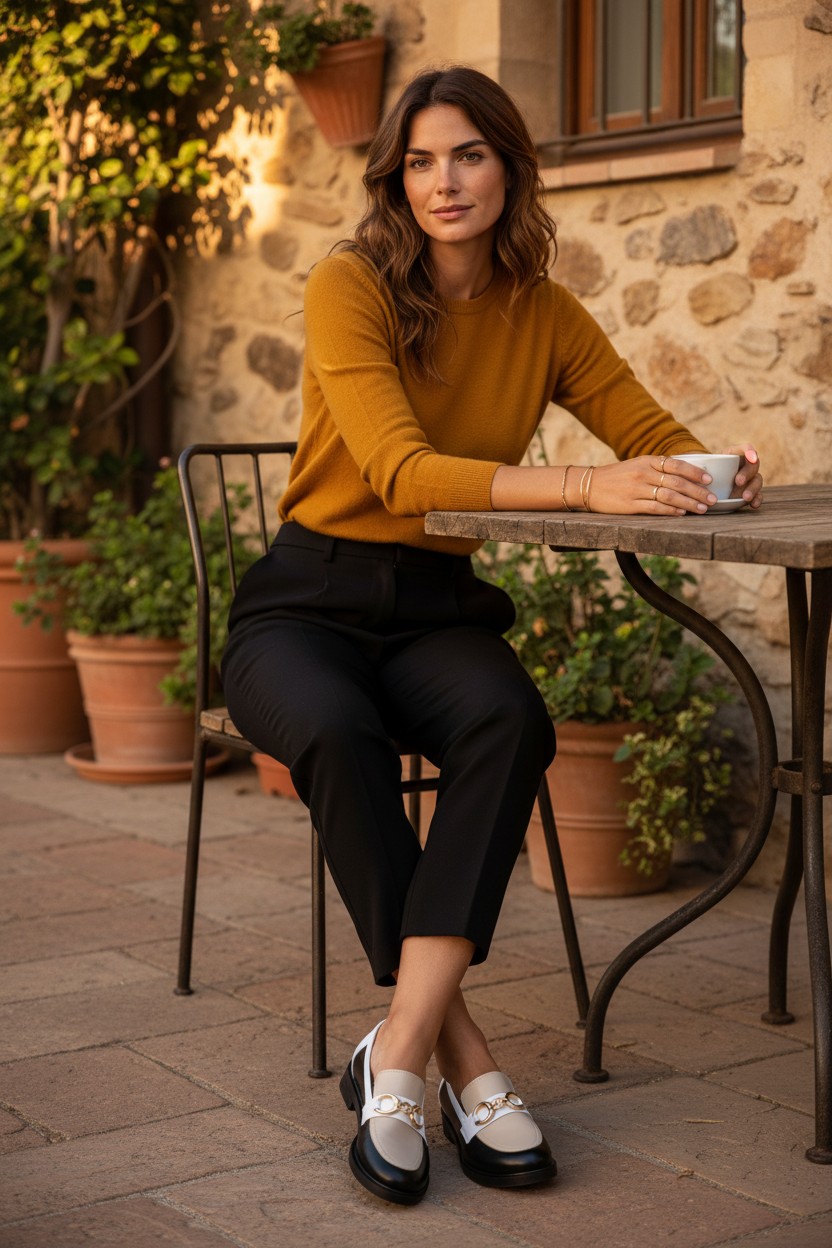Ten model wyjątkowo dobrze współgra z garderobą opartą na klasycznych kolorach. Pięknie wygląda w zestawieniu z czernią, ecru, kremem, jasnym beżem, czekoladowym brązem i chłodną bielą. Możesz też eksperymentować z każdym nasyconym kolorem (szmaragd, karmin, fiolet). Kluczem jest gładka faktura góry i gładki dół, aby pozwolić graficznemu wzorowi na loafersach „mówić” samym za siebie! Można nosić go do prostych spodni, miękkiej dzianiny i marynarki, ale równie dobrze prezentuje się ze spódnicą midi, elegancką koszulą czy minimalistyczną sukienką. Czarno-beżowe mokasyny bardzo dobrze przełamują formalne stylizacje, nadając im lekkości, a jednocześnie zachowując elegancki, dopracowany charakter. To model, który świetnie wygląda także w duecie z torebką utrzymaną w tej samej, spokojnej palecie kolorystycznej.