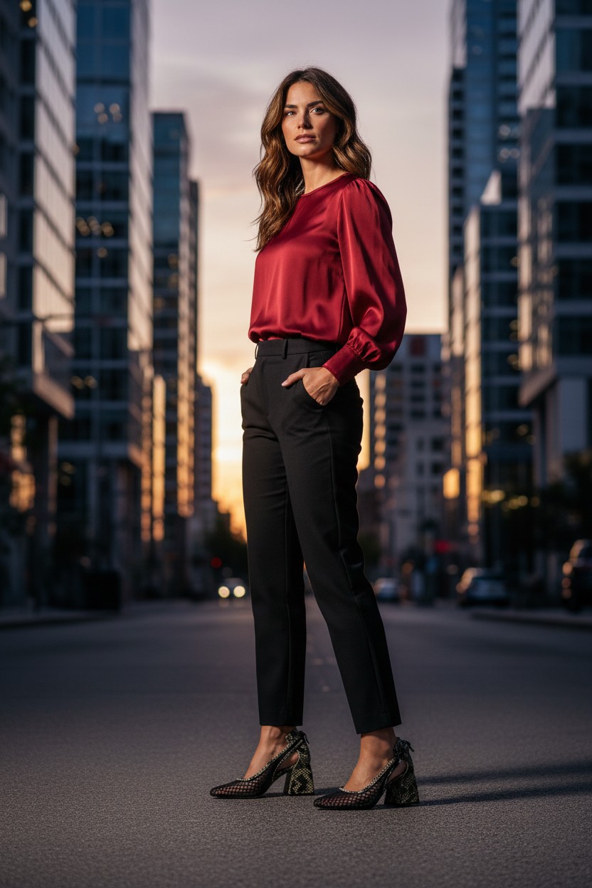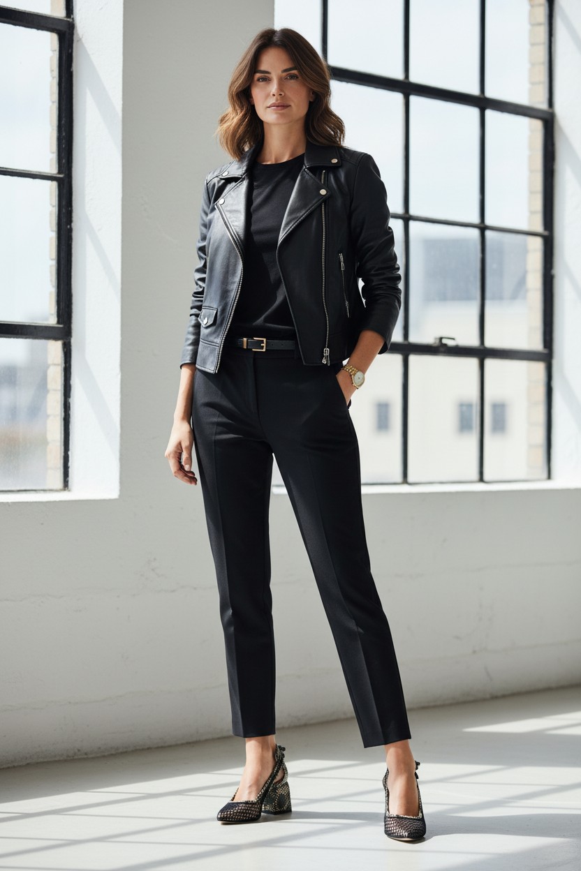 W wersji nowoczesnej można zestawić go z czarną skórzaną kurtką i prostymi spodniami. W bardziej eleganckim wydaniu świetnie zagra z czarną spódnicą, gładką sukienką albo satynową koszulą. To model, który może być i miejski, i wieczorowy — dużo zależy od reszty stylizacji.