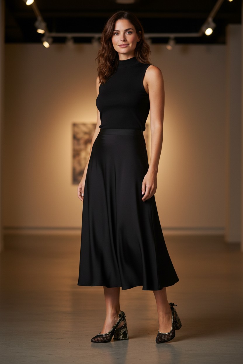 Bolejko Veil Black najlepiej wygląda w stylizacjach, które zostawiają butowi przestrzeń. Świetnie działa z czernią, grafitem, złamaną bielą, śmietanką, satyną, skórą i prostymi fasonami. Bardzo dobrze wypada z cygaretkami, prostymi spodniami 7/8, ołówkową lub miękko układającą się spódnicą midi, a także z bardziej wieczorową koszulą czy topem.
